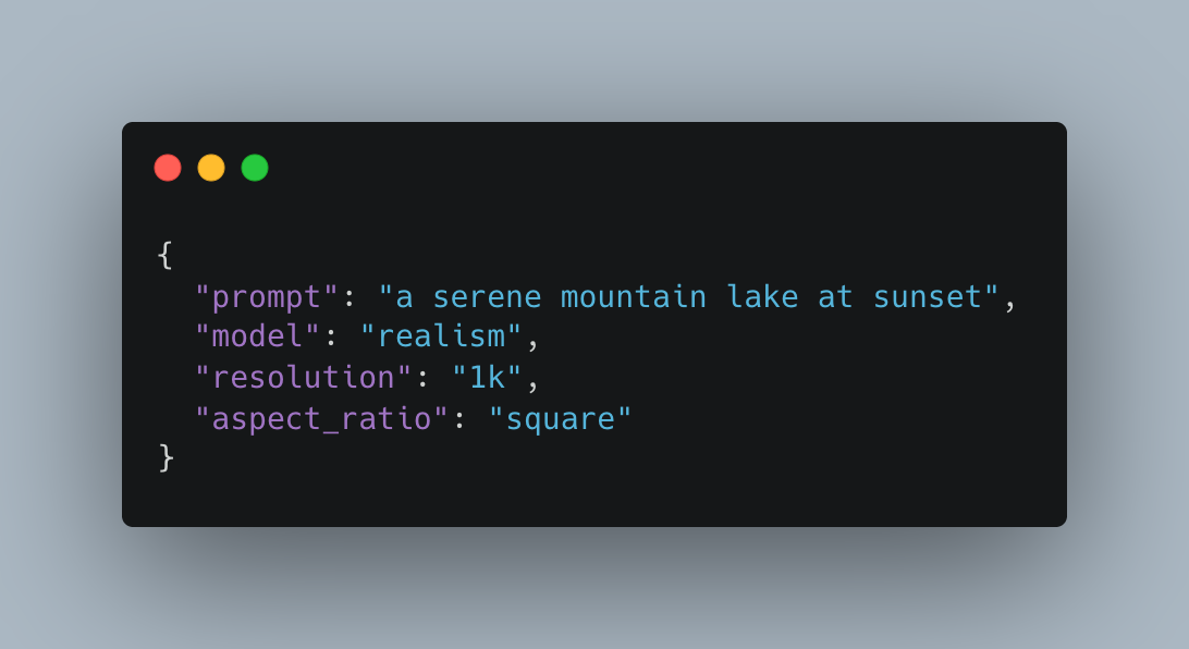 Parameters like prompt, model, resolution, and aspect ratio are included in the request, with the response containing generated image URLs and metadata. This endpoint requires a valid Freepik API key for authentication.
