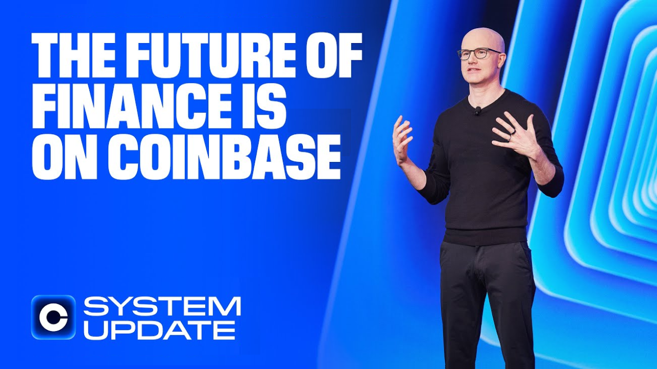 Coinbase's Head of Consumer onstage during System Update event with a headline next to him that says "Introducing the Everything Exchange"